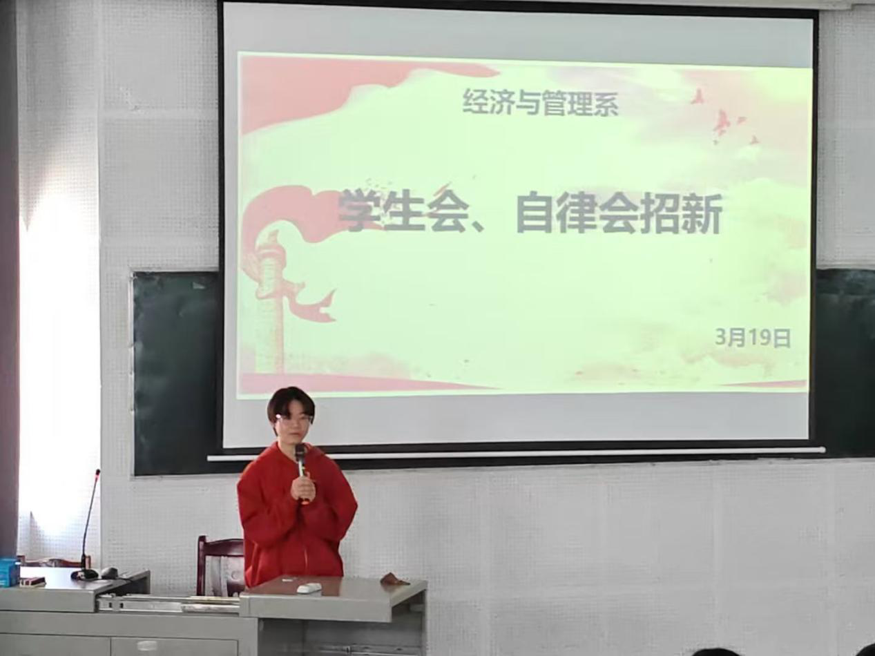 (通讯员 宋怀意)2025年3月19日中午12:30于T图南举行经济与管理系团学组织、大学生自律委员会招新暨第二次干部干事会议。参与本次例会的有学工办主任朱立露、辅导员梁倩倩、刘俊帆及团学组织、自律会全体干部干事。财管2401班陈孟仙同学担任本次大会的主持人。