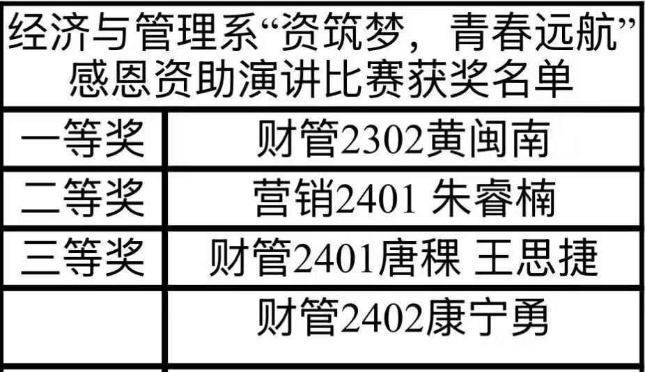 本次演讲比赛的成功举办,对于学生而言,这不仅是一个展示风采、锻炼能力的舞台,更是一次涤荡心灵、凝聚共识的精神洗礼。经管学子必将以青春为笔、奋斗为墨,传承这份大爱,在追逐理想的道路上奋力书写无愧于时代的青春华章。