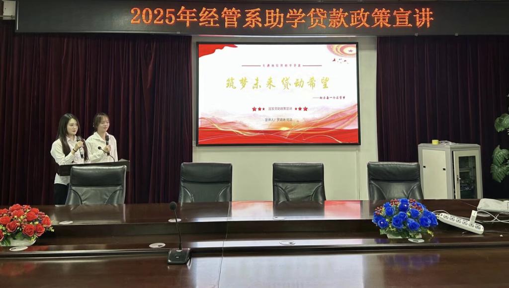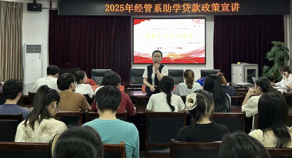 (通讯员 张禹权)为进一步彰显国家教育公平理念,切实筑牢不让一个学子因家庭经济困难而失学的坚实保障。我系于2025年6月13日中午12:30在第二会议室举行了经济与管理系助学贷款宣讲会。经管系主任彭婷、学工办主任朱立露以及主席团成员出席此次活动。财管2401班罗婧琳、何洁同学担任此次活动的宣讲人。