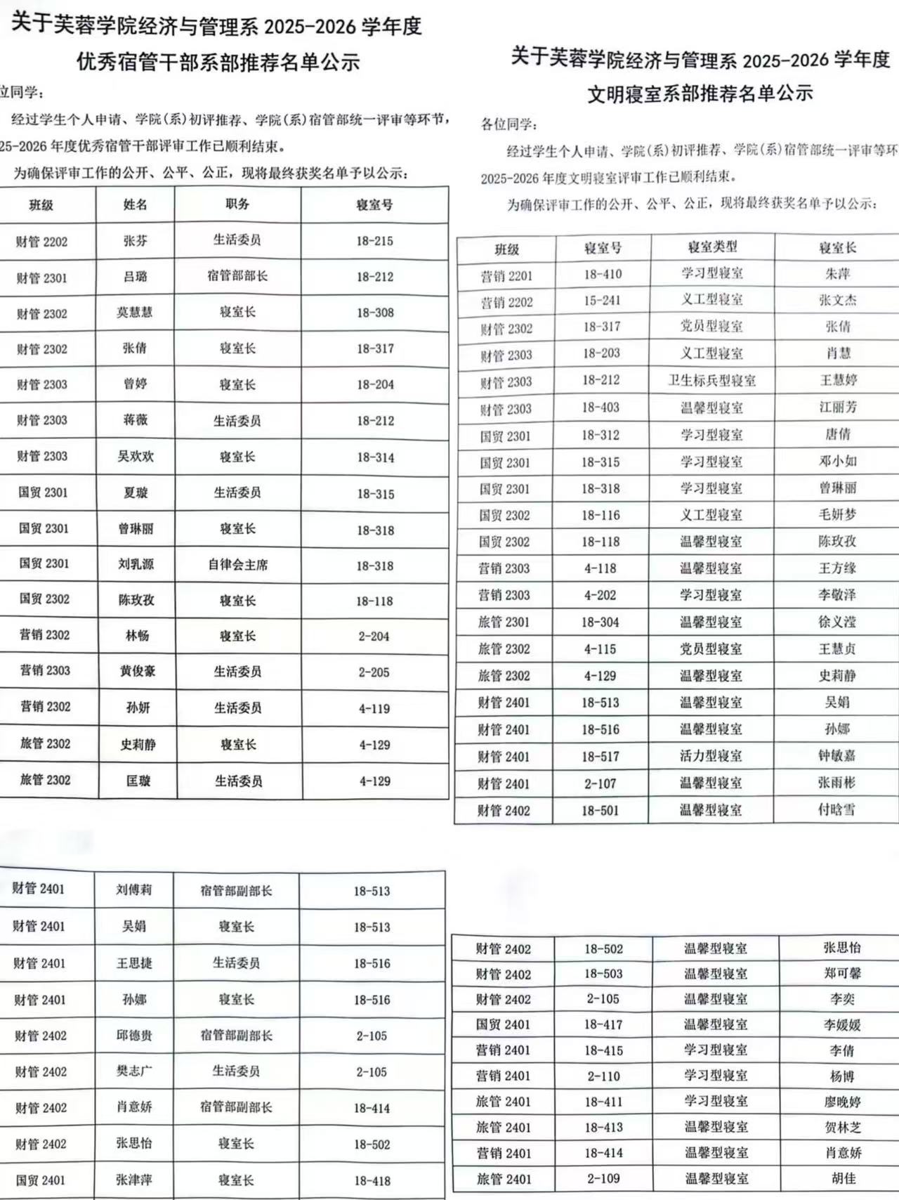 为深化校园精神文明建设,湖南文理学院芙蓉学院经济与管理系于2025年11月25日成功举办了2025-2026学年度文明寝室评选与优秀宿管干部评比活动。