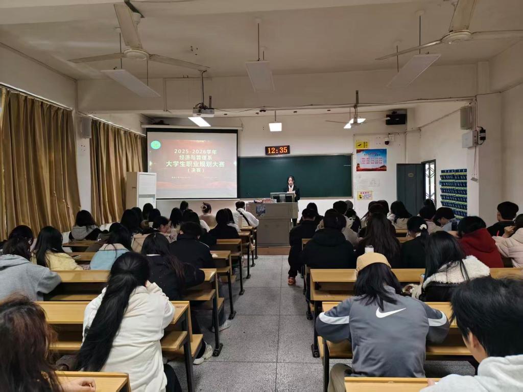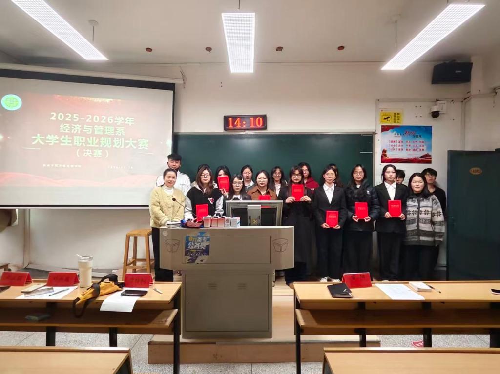 聚焦国家战略需求与人才培养导向,着力提升学生的社会责任感和职业使命感。为全面落实立德树人根本任务,引导学生树立与时代同心同向的理想信念,湖南文理学院芙蓉学院经济与管理系于2025年11月26日中午12:30在E2-A102教室成功举办2025年大学生职业生涯规划大赛决赛。本次比赛评委团由经管系系主任陆沛年主任、学工办主任朱立露老师、辅导员梁倩倩老师、曾梓桐老师、邓雨薇老师、雷阳老师组成。财管2402班张慧担任本次大赛主持人。