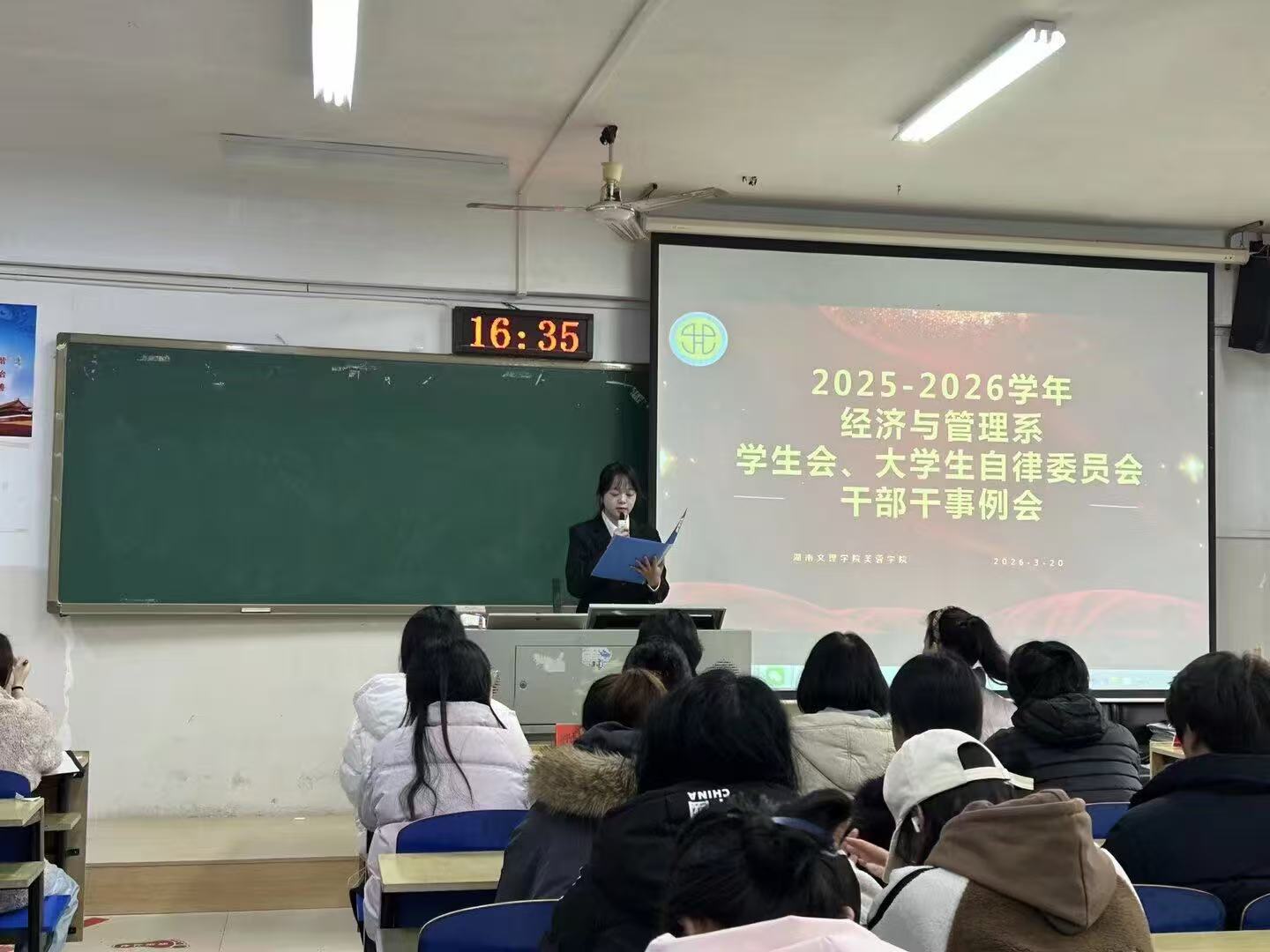 (通讯员 王思思)为凝心聚力明确新学期工作方向,强化学生干部责任担当,经济与管理系于2026年3月20日16:30,在T3-A203教室召开2025-2026届团学组织、大学生自律委员会第三次干部干事例会,经管系主任陆沛年老师,学工办主任朱立露老师,辅导员梁倩倩老师、曾梓桐老师、雷阳老师、邓雨薇老师以及团学组织和大学生自律委员会的全体干部干事共同参会,财管2401班何洁同学担任本次大会的主持人。